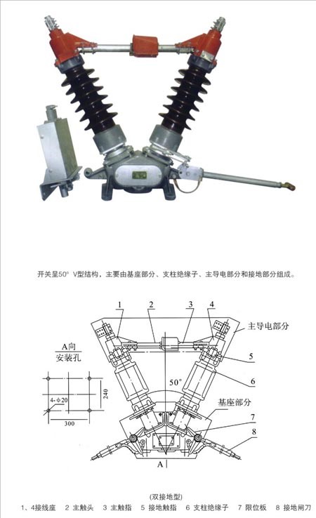2) 隔离开关属双柱V形水平开启式,各单级都由基座、支柱绝缘子、出线座及触头等部分组成,由成50°夹角的两个支座、两支柱绝缘子相互夹角地安装在基座两端轴承上,且与基座垂直。主导电部分分别安装在两支柱绝缘瓷瓶上方,随支柱绝缘瓷瓶作约90°转动。