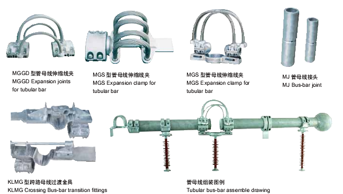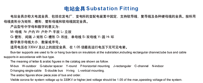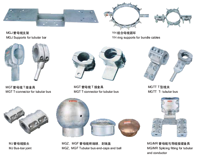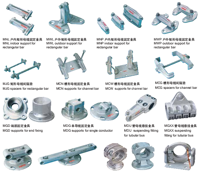 户内母线固定金具MNP平放式,MWP平放式,MNL立放式,MWL立放式,矩形母线间隔垫MJG,槽形母线固定金具(MCN,MCW),槽形母线间隔垫MCG,管形母线固定金具,软母线金具,跨路金具,铝合金导电管母线