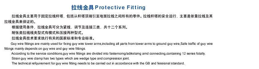 详细描述拉线金具:楔形线夹,UT型线夹,耐张线夹止退板,UT型线夹,拉线用U型挂环,钢线卡子,双拉线用联板,挂板,防盗帽,防盗螺母