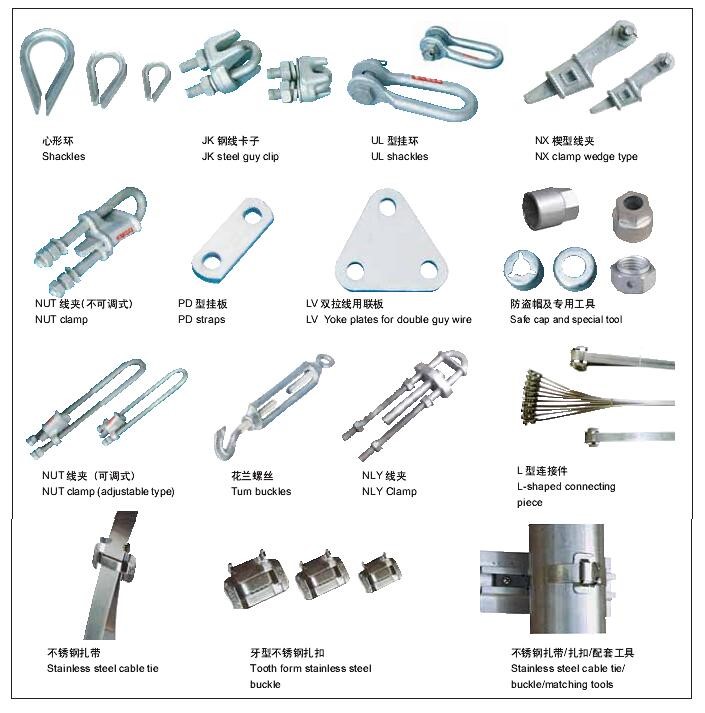 拉线金具:楔形线夹,UT型线夹,耐张线夹止退板,UT型线夹,拉线用U型挂环,钢线卡子,双拉线用联板,挂板,防盗帽,防盗螺母